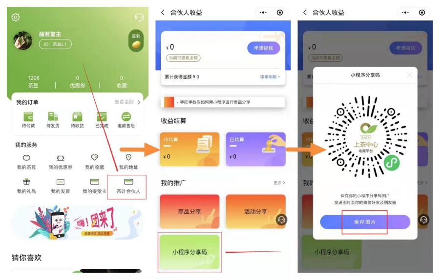 1):登录上茶中心电商平台微信小程序,选择“我的“——“茶叶合伙人”,进入合伙人页面