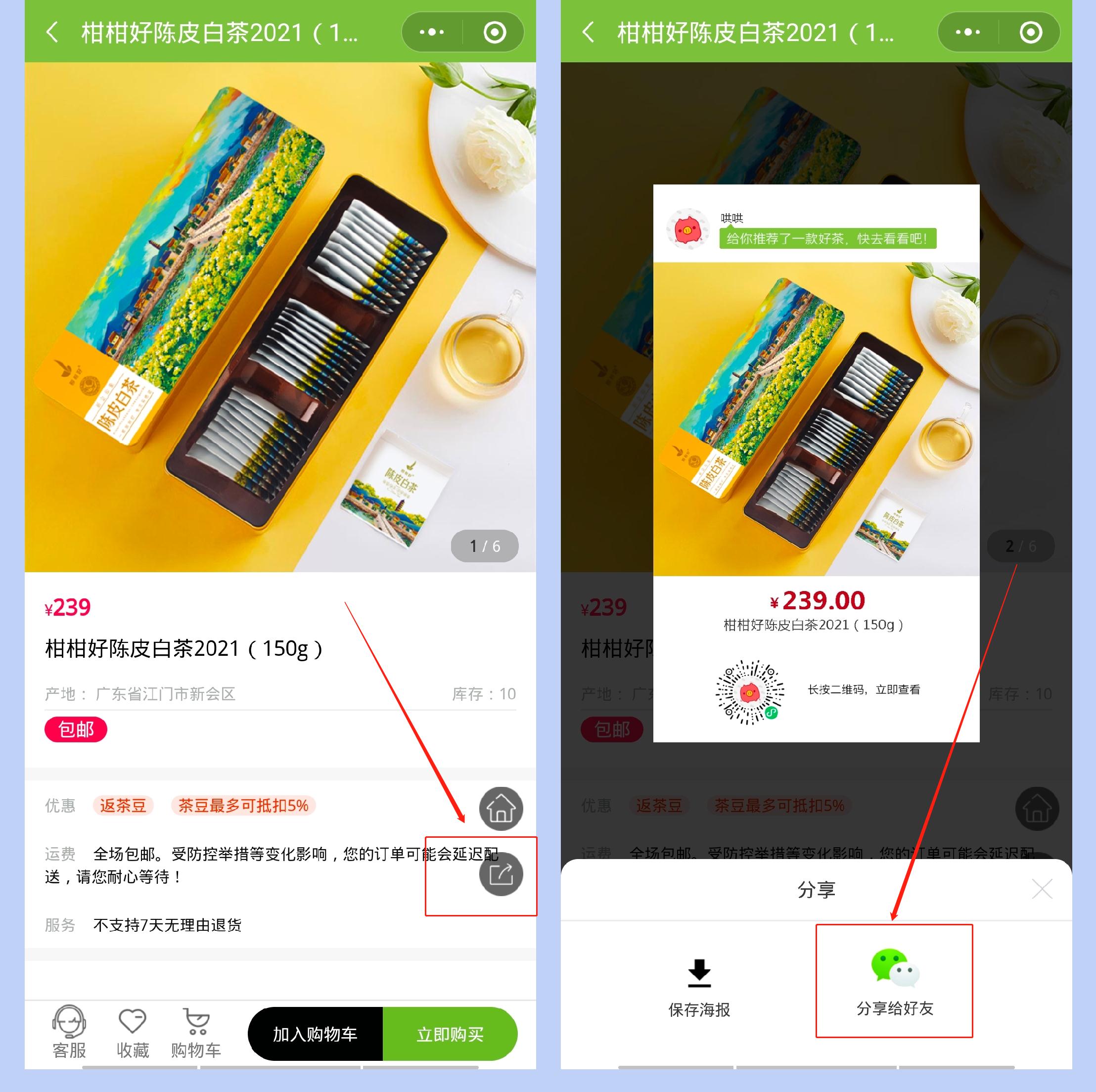 1)分享商品给微信好友:选择需要分享的商品,点击页面内的分享按钮,选择“分享给好友”或“保存海报”分享。