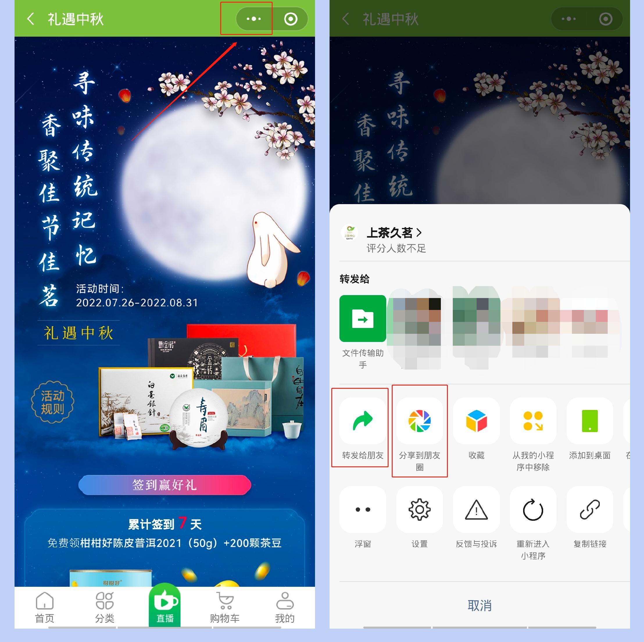 优点:可分享当前正在进行的活动,也可以分享需要推广的商品,分享形式为小程序卡片,支持分享微信好友、微信群及微信朋友圈,方便微信好友快速打开。