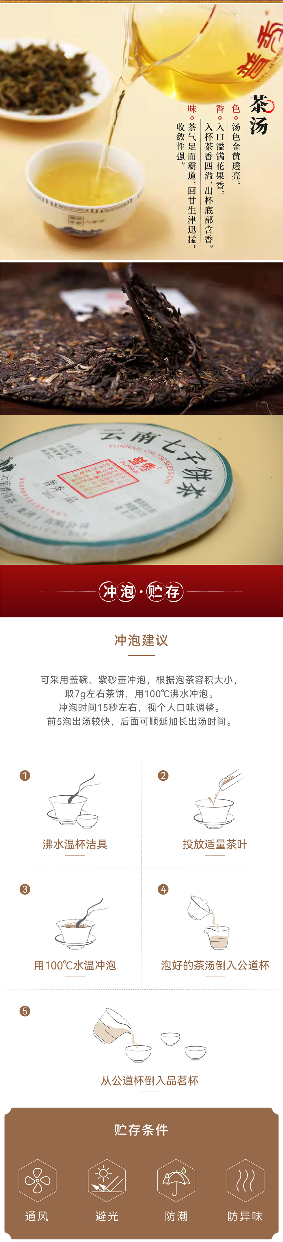 口  感: 干茶:饼形周正,圆润饱满,松紧适宜;茶汤:汤色金黄透亮,香气:入口溢满花果香。入杯茶香四溢,出杯底部含香;滋味:茶气足而霸道,回甘生津迅猛,收敛性强。